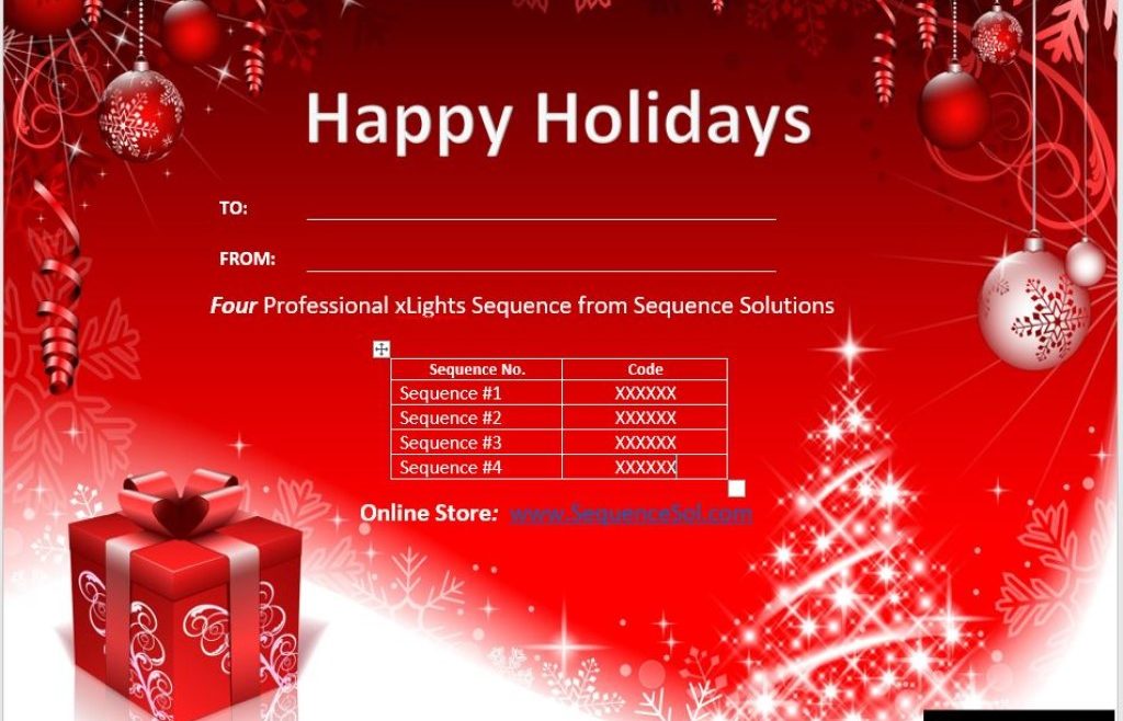 4 Sequence Gift CertificateFour xLights Sequences Download will include a PDF Gift Certificate with a download code for Qty. (4) (Four) sequences from the online store. TO and FROM lines Codes never Expire and can be used at any time. $150.00 – Purchase Checkout Added to cart